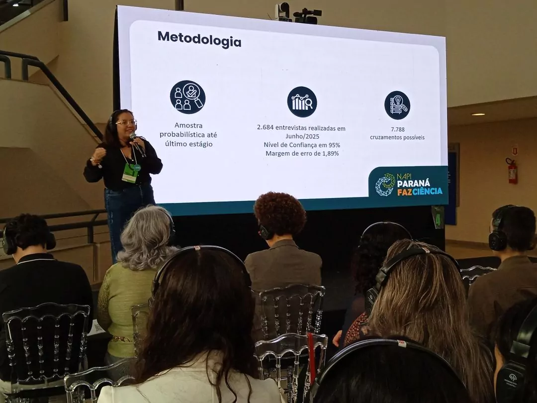 Os resultados da primeira ‘Pesquisa de Percepção Pública da Ciência, Tecnologia e Inovação 2025’ pelos paranaenses foi apresentada na Semana Araucária pela bolsista pós-doc da Rede Paraná Faz Ciência, Tamara Domiciano, objeto de sua tese de doutorado. De acordo com a pesquisadora, os dados revelam que os paranaenses confiam na ciência e nos cientistas, e têm interesse em conhecer mais sobre CT&I.