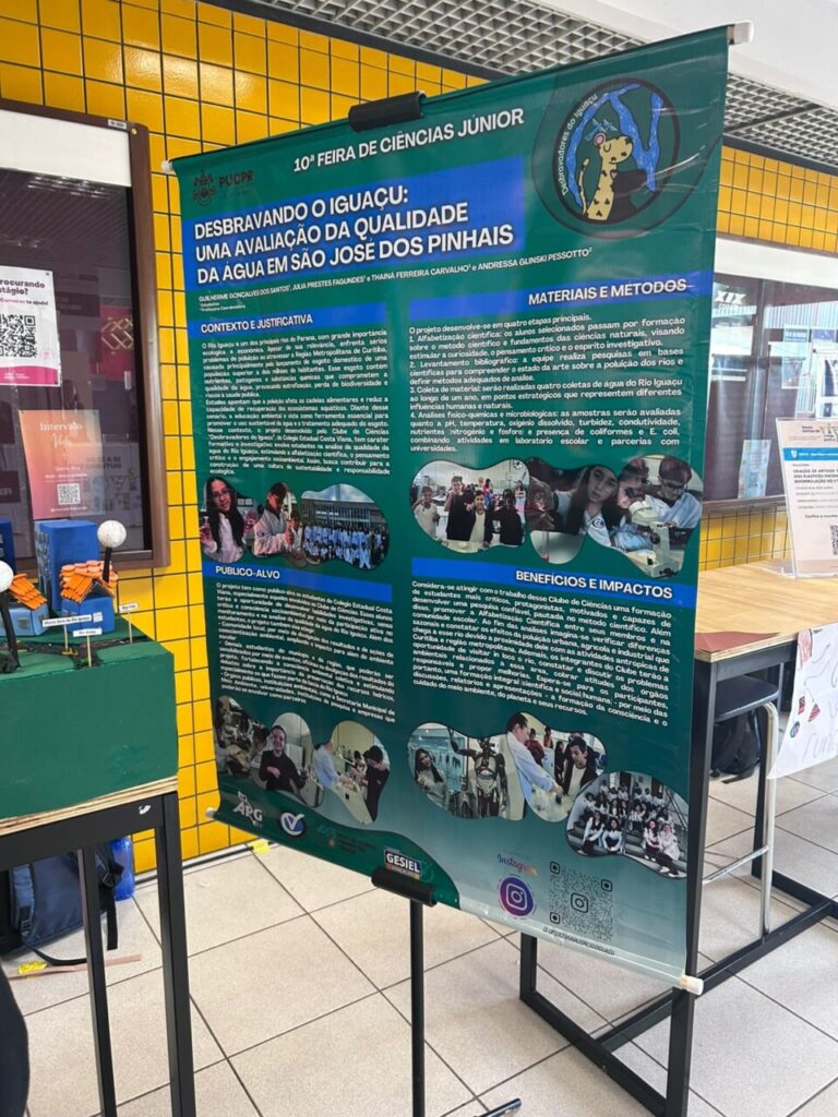O Clube de Ciências Desbravadores do Iguaçu, do Colégio Estadual Costa Viana, em São José dos Pinhais, alcançou o terceiro lugar na 10ª Feira de Ciências Júnior, ocorrida entre 20 e 23 de outubro na Pontifícia Universidade Católica do Paraná (PUCPR). A premiação do clube foi na categoria Ensino Fundamental II, reconhecendo o projeto “Desbravando o Iguaçu: uma avaliação da qualidade da água em São José dos Pinhais“.