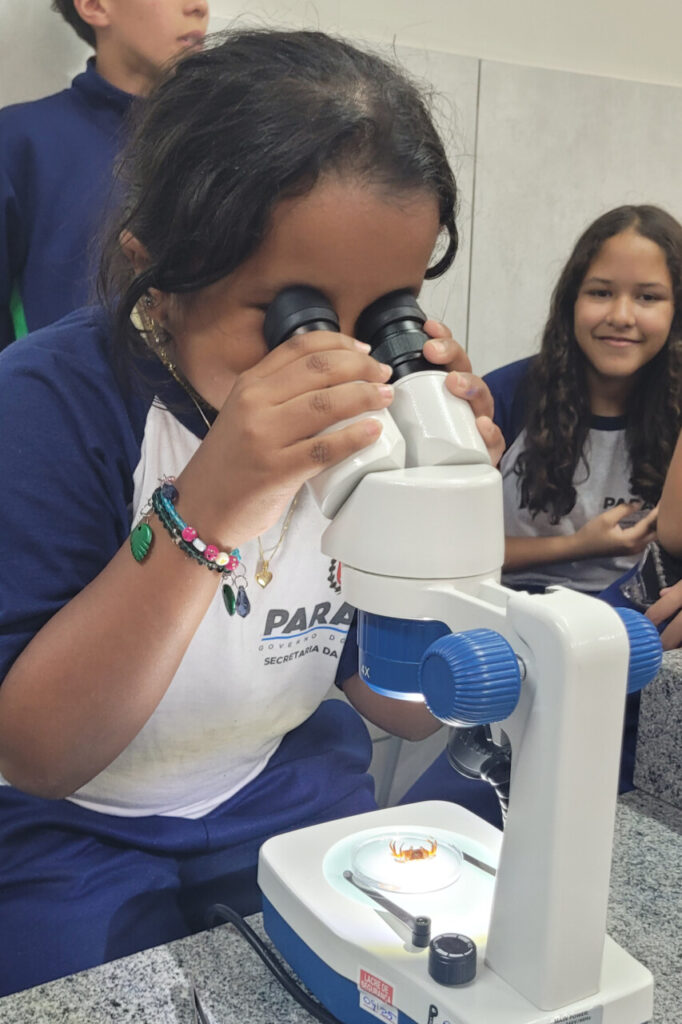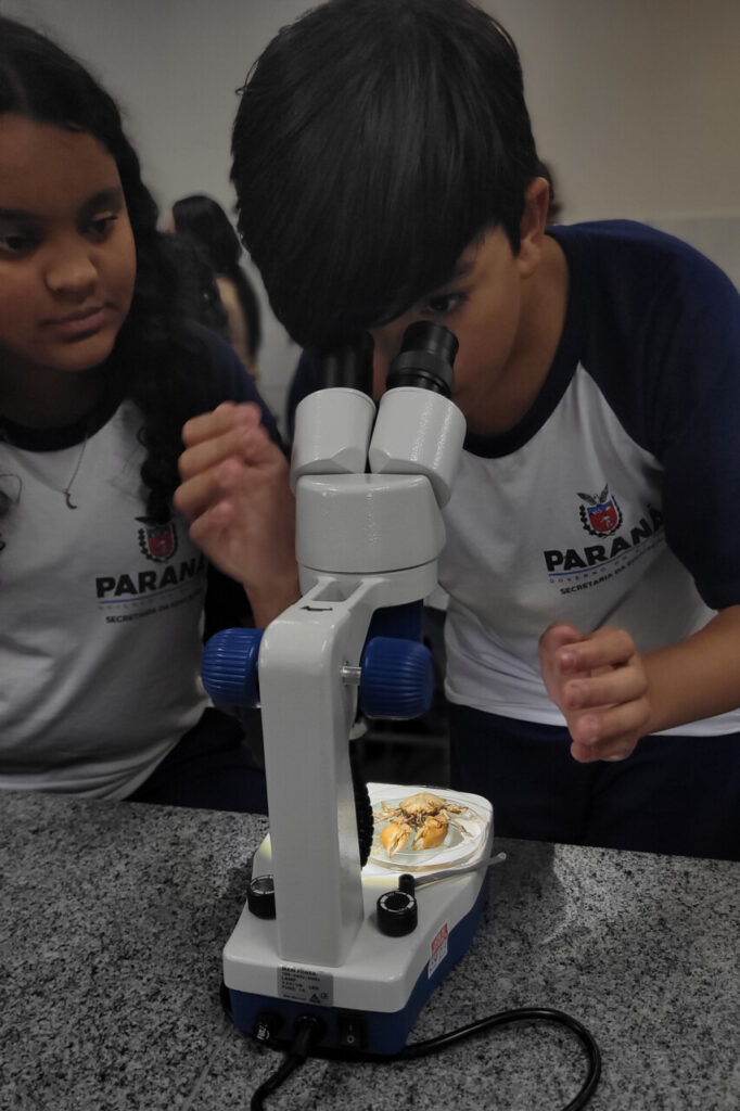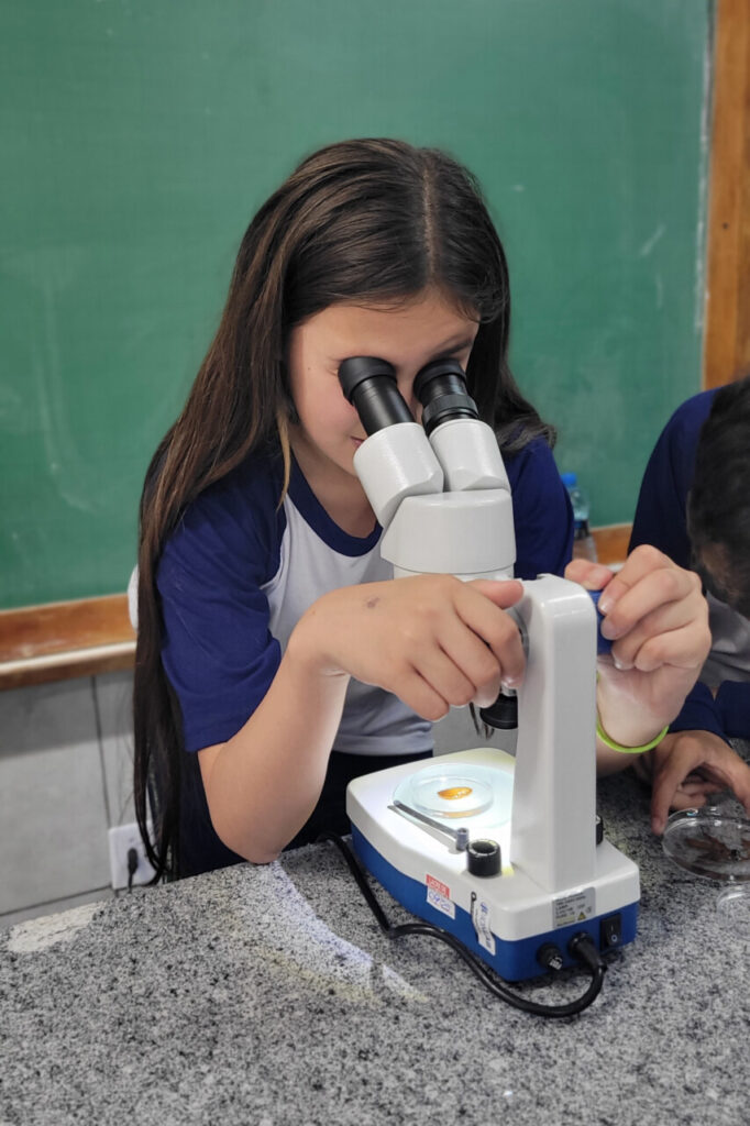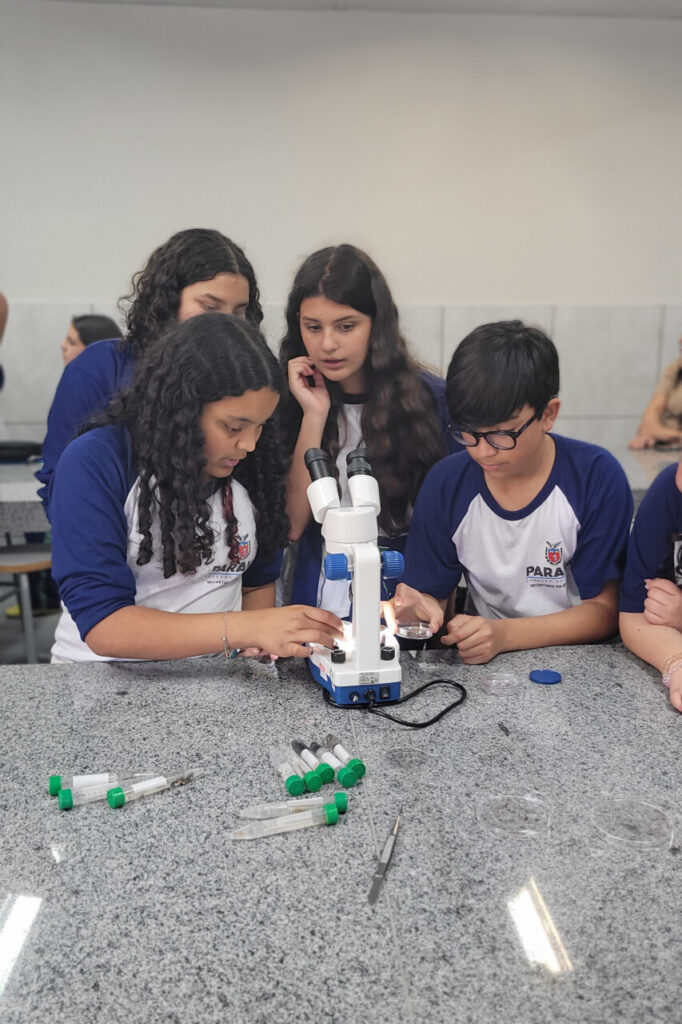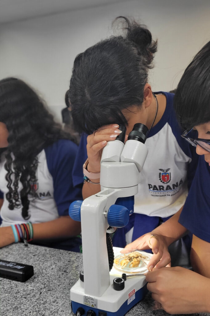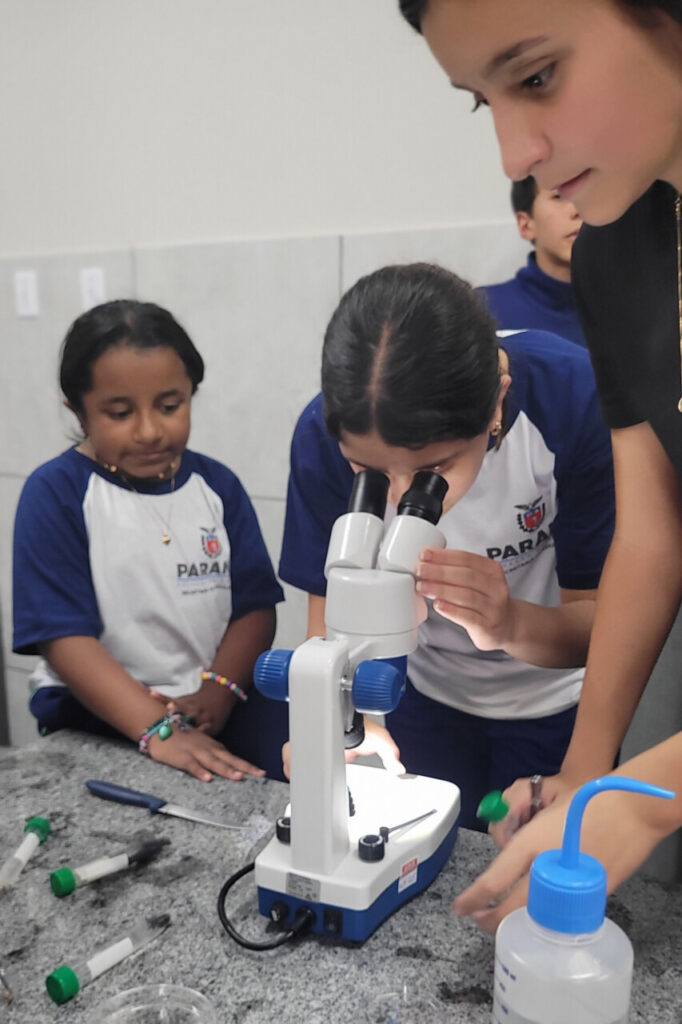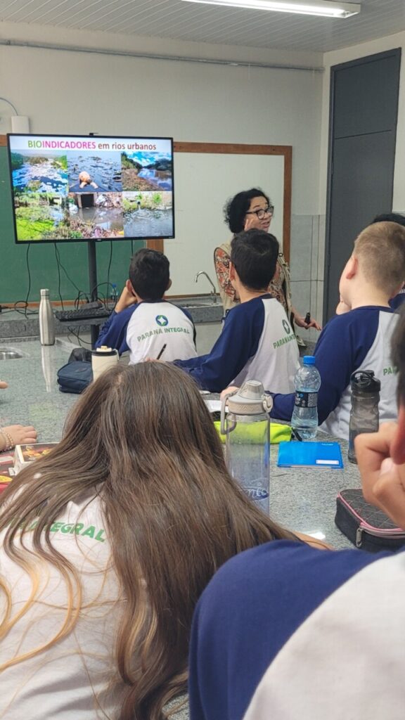 Esse aprendizado se conecta ao percurso já trilhado pelo grupo em sua pesquisa sobre o rio Belém, vizinho da escola e de grande parte dos alunos. Ou seja, ‘olhar de perto’ aqui, significa também voltar-se para o próprio território, perceber os sinais que a água carrega e compreender que a biodiversidade está intimamente ligada à vida e ao dia a dia da comunidade.