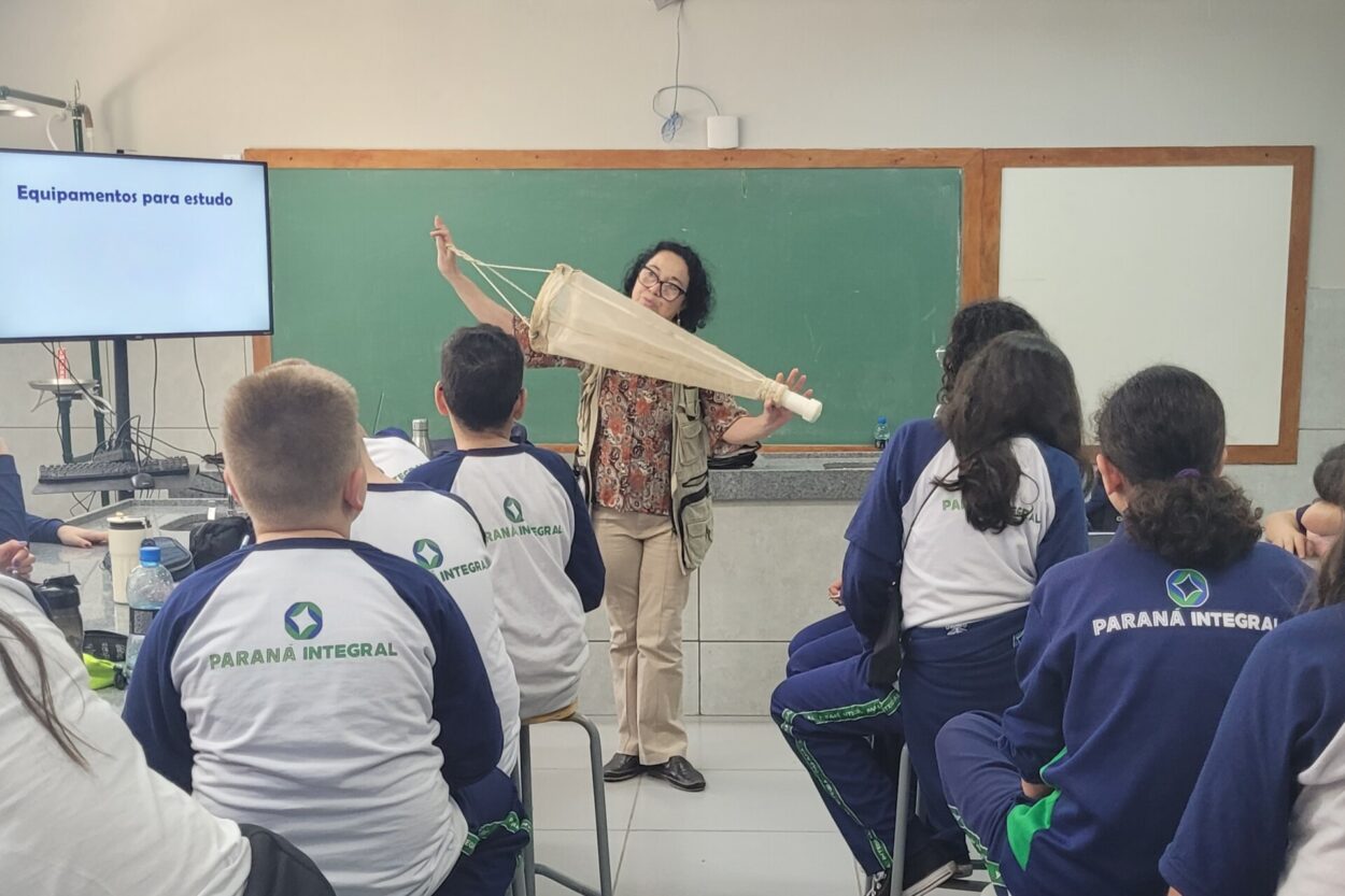 Para os integrantes do clube, formado por alunos do Ensino Fundamental II da Escola Isolda Schimid, ‘olhar de perto’ foi além do uso da lupa. A atividade integrou a palestra O Rio e sua biodiversidade, realizada pela professora e bióloga Edinalva Oliveira, em que cada estudante foi convidado a perceber a ciência também por outra dimensão: a do trabalho de campo. Redes de coleta, recipientes e até a perneira, item de proteção em áreas alagadas, mostraram que a investigação dos rios exige preparo, técnica e cuidado. Nesse contexto, a ciência revelou-se como prática que une observação minuciosa e interação direta com o ambiente.