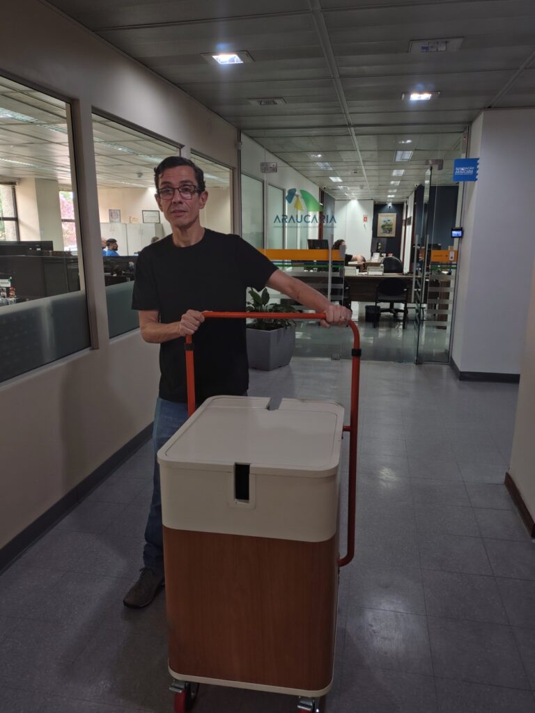 O bolsista técnico que auxiliou a criação, Giuliano Perreto, completa, explicando sobre a facilidade de uso do expositor.  “A ideia é você conseguir fechar tudo e todos os componentes irem dentro da estrutura, que você consiga desmontar e carregar como um carrinho”.
