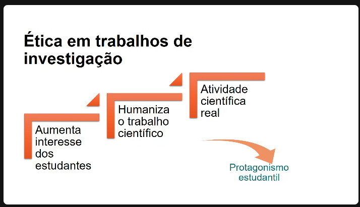 Para completar a relação com a comunicação científica, a pesquisadora apresentou o ciclo de premissas que inclui trabalhar com vertentes conceitual, atitudinal e procedimental. Essas três premissas existem concomitantemente durante o processo científico, desde a escolha de temas, no contato com entrevistados ou contextos sociais até o desenvolvimento e apresentação dos resultados à sociedade. “Durante todas as fases, não é só nos conceitos que os estudantes devem se balizar, mas também pelas atitudes e procedimentos éticos. Eles precisam entender que suas ações podem impactar sua vida e a de outras pessoas envolvidas”, reforça.