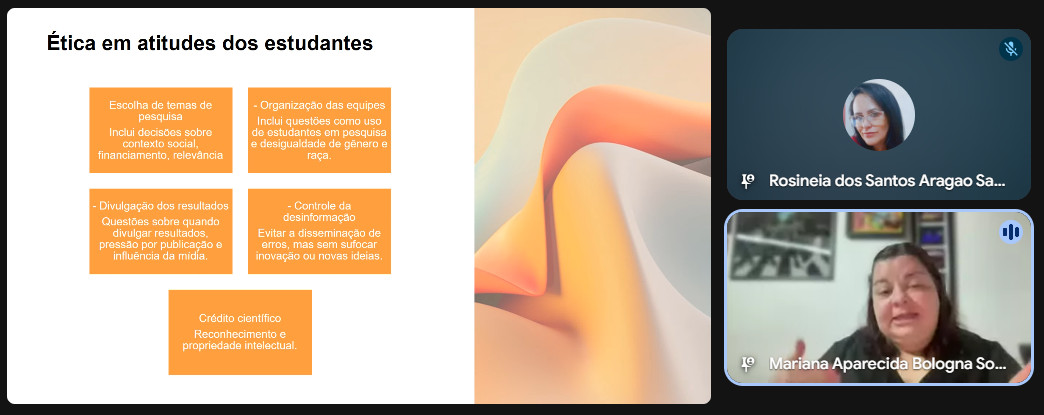 “Mesmo que existam códigos de conduta diferentes, seja qual for o lugar que vamos, algumas práticas precisam ser sempre respeitadas. Do contrário pode haver um relativismo moral, que significa agir seguindo uma regra dada, ainda que seja absurda”, explica a docente. Mariana reforçou que fazer ciência, como uma atividade humana, vem acompanhado de conceitos e julgamento de valores, e que o papel do professor passa também por orientar o estudante sobre como se comportar e o que considerar nas escolhas e decisões que tomam em suas pesquisas.