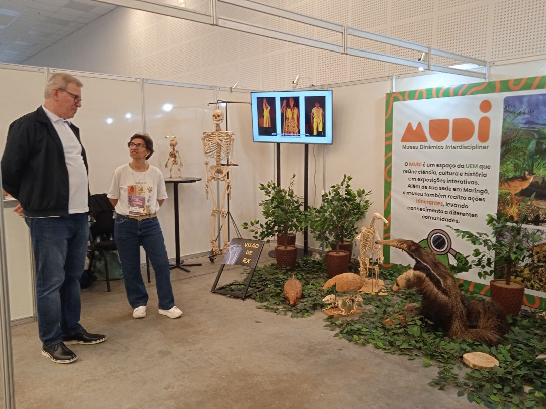 Conegero esteve acompanhado da professora da UEM, Ana Paula Vidotti, coordenadora do projeto de extensão Muditinerante, responsável pelo estande do museu na mostra. “Trouxemos nossa exposição Raio X, que permite verificar as características ósseas do corpo humano e de outras espécies da fauna brasileira”, conta.