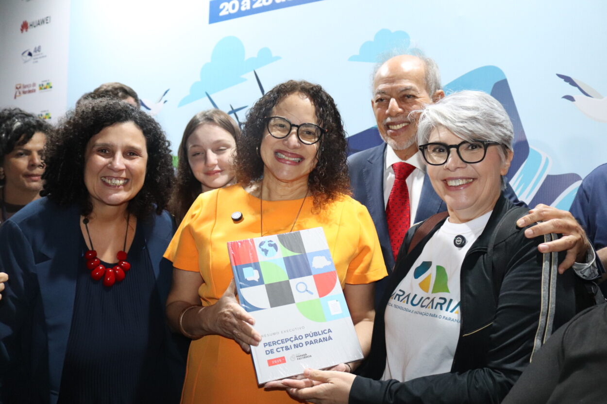 Durante toda a SNCT, a articuladora do NAPI PRFC, Débora Sant’Ana, distribuiu exemplares do Resumo Executivo de Percepção Pública de Ciência e Tecnologia no Paraná e do Guia de Espaços de Divulgação Científica do Estado, publicações produzidas pelo Arranjo. Autoridades como Luciana Santos, Inácio Arruda, Juana Nunes e Ana Noronha receberam os materiais.