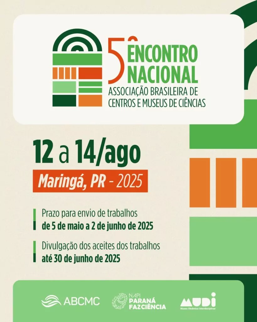 Uma parceria entre o Novo Arranjo de Pesquisa e Inovação Paraná Faz Ciência (NAPI PRFC) e o Museu Dinâmico Interdisciplinar da Universidade Estadual de Maringá (MUDI/UEM) está viabilizando o V Encontro Nacional da Associação de Centros e Museus de Ciências, realizado anualmente pela Associação Brasileira de Centros e Museus de Ciências (ABCMC). É a primeira vez que o evento acontece numa cidade do interior do Brasil, e será em Maringá, Noroeste do Paraná. Além do NAPI PRFC e o MUDI, o evento conta com a parceria e apoio de diversas instituições.