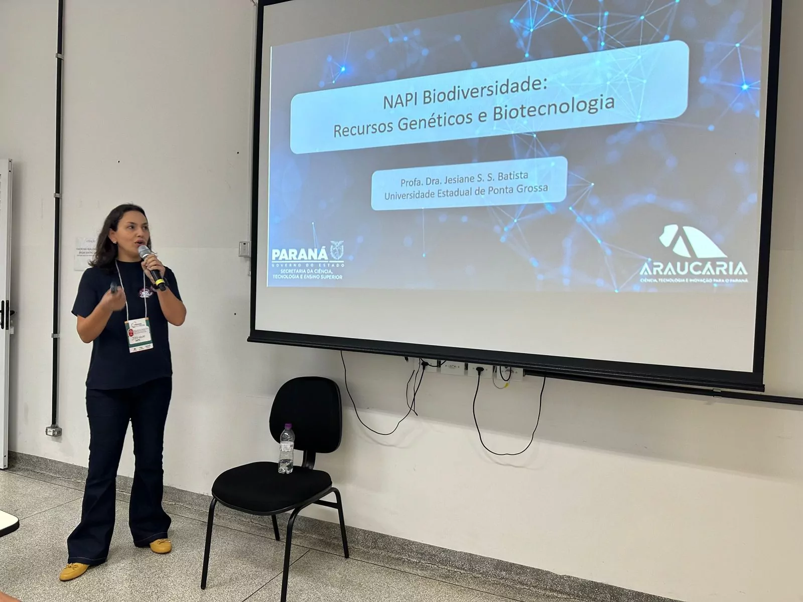 A professora Dra. Jesiane Stefânia da Silva Batista da Universidade Estadual de Ponta Grossa (UEPG) apresentou, na sequência, o NAPI Biodiversidade Recursos Genéticos e Biotecnologia. De acordo com a articuladora, o NAPI tem como meta aliar o conhecimento e a conservação dos recursos genéticos do Estado – bactérias, fungos, plantas, animais – as estratégias de utilização das potencialidades biotecnológicas.