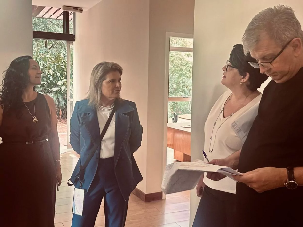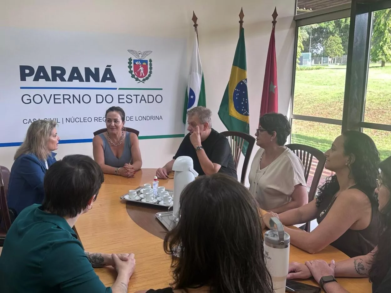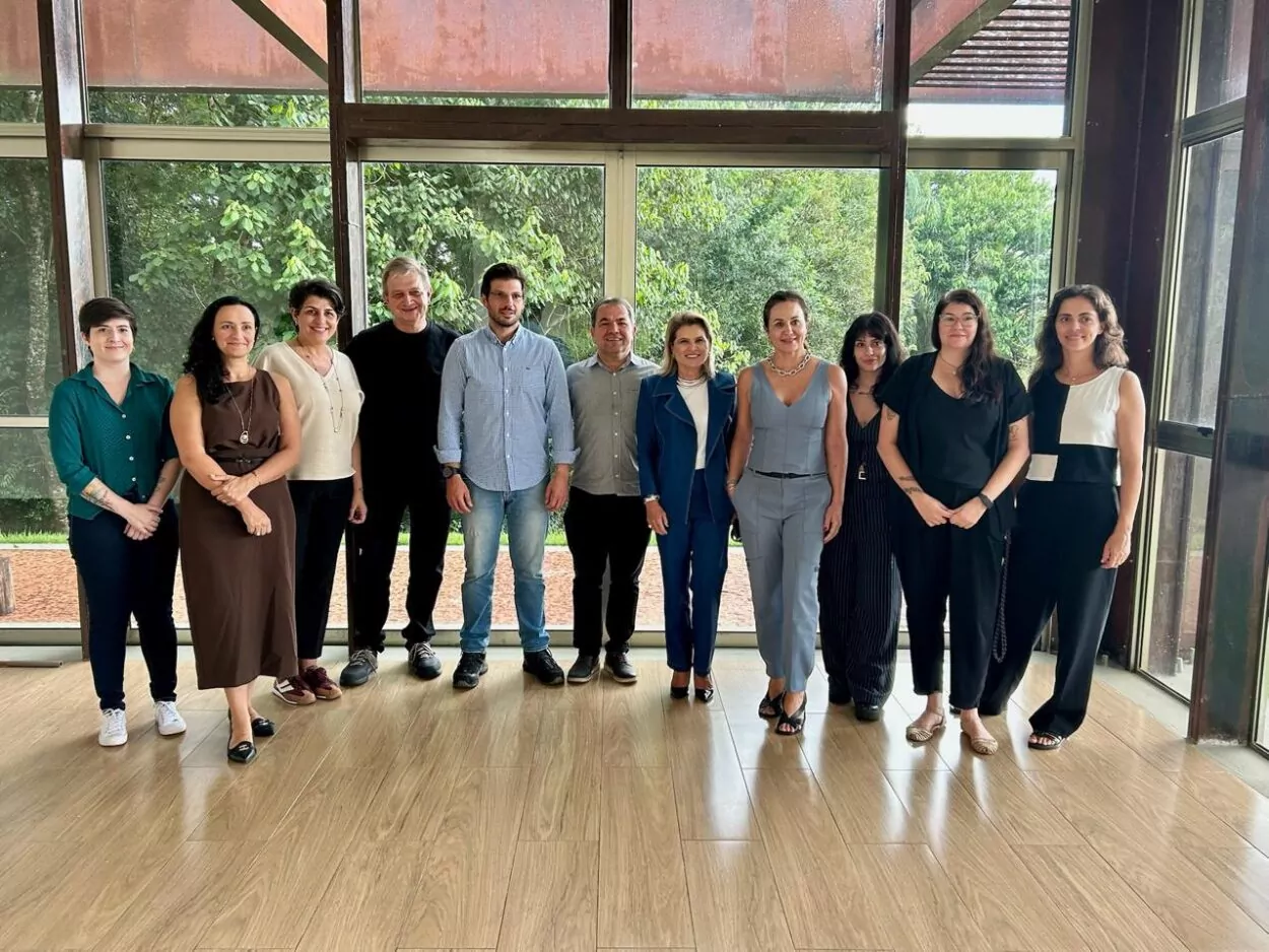 Na reunião realizada nesta quinta-feira, 26 de fevereiro, participaram representantes da Fundação Araucária, Cristianne Cordeiro; da Casa Civil do Paraná em Londrina, Sandra Moya; a pesquisadora Renata da Rosa, vice-coordenadora das pesquisas em Cadeia Produtiva da Seda pela Universidade Estadual de Londrina (UEL); o prefeito de Londrina, Tiago Amaral; o secretário municipal de Meio Ambiente, Gilmar Domingues Pereira, acompanhado de sua equipe; e os representantes do escritório de arquitetura Aukland, responsável pelo projeto arquitetônico e pela expografia da futura Quinta, Aurélio e Karine Sant’Anna.